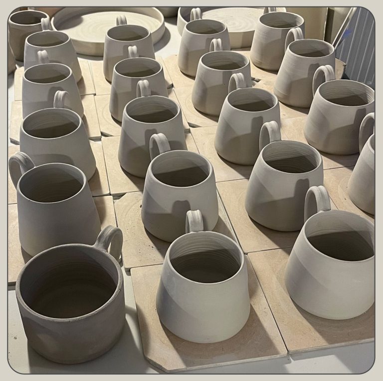 Having created the shape the piece is set aside to firm up and become leather hard. At this point it is put back onto the wheel to be turned, or refined. Any handles are also pulled and added at this stage.